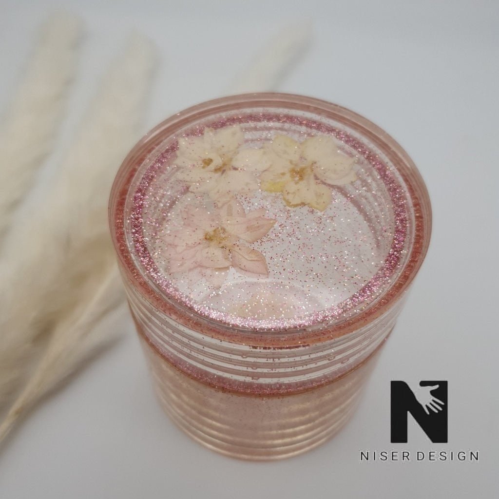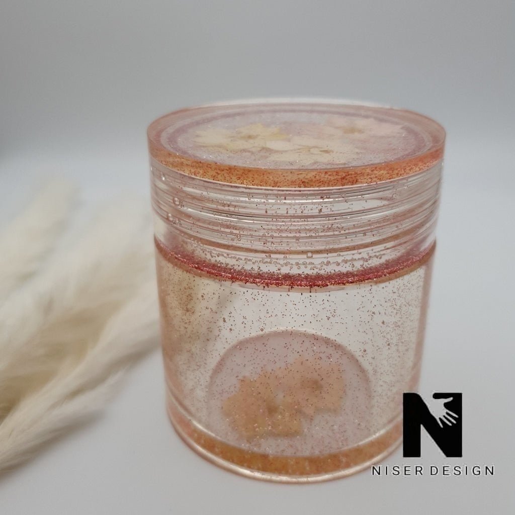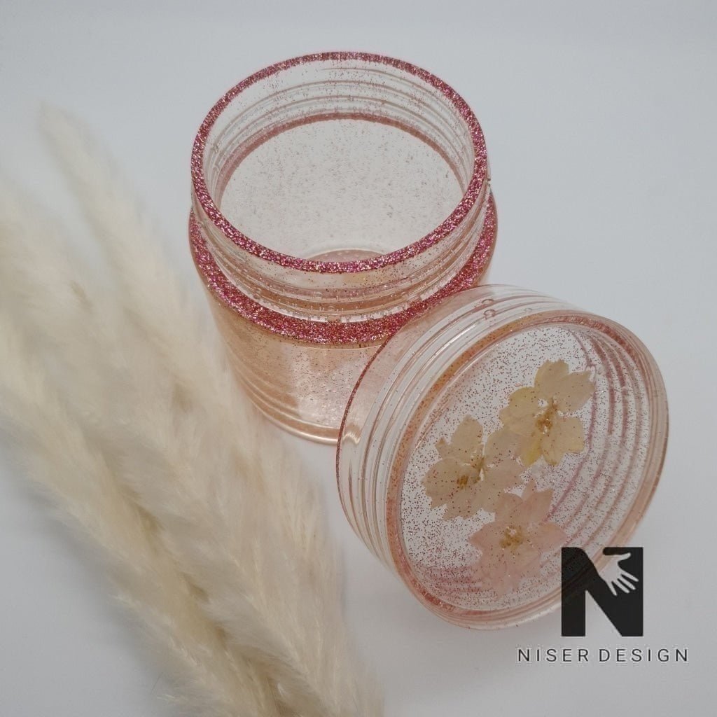 Einen jugendlichen Charme bringt diese Dose mit Schraubdeckel in dein Zuhause. Durchlässig zart lässt sie einen Blick auf den Inhalt zu. Die eingearbeiteten rosè farbenden Blumen und der eingearbeitete Glitzer lassen Mädchenträume wahr werden. Ein Highlight auf jedem Schminktisch.